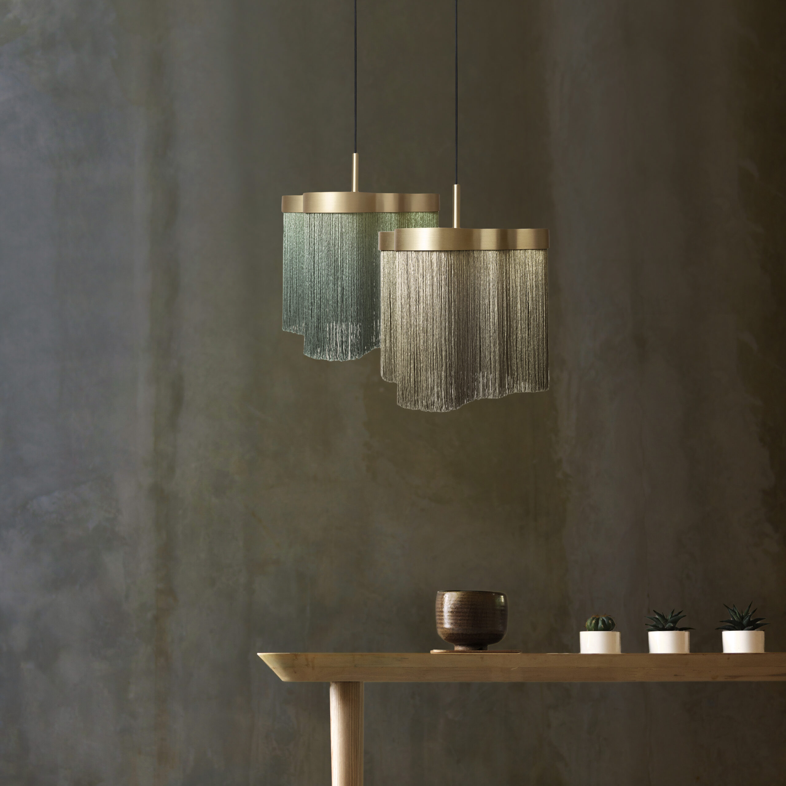 Arcipelago embodies the refined aesthetic of Servomuto, featuring a satin brass body and fire-resistant Trevira CS fringes.