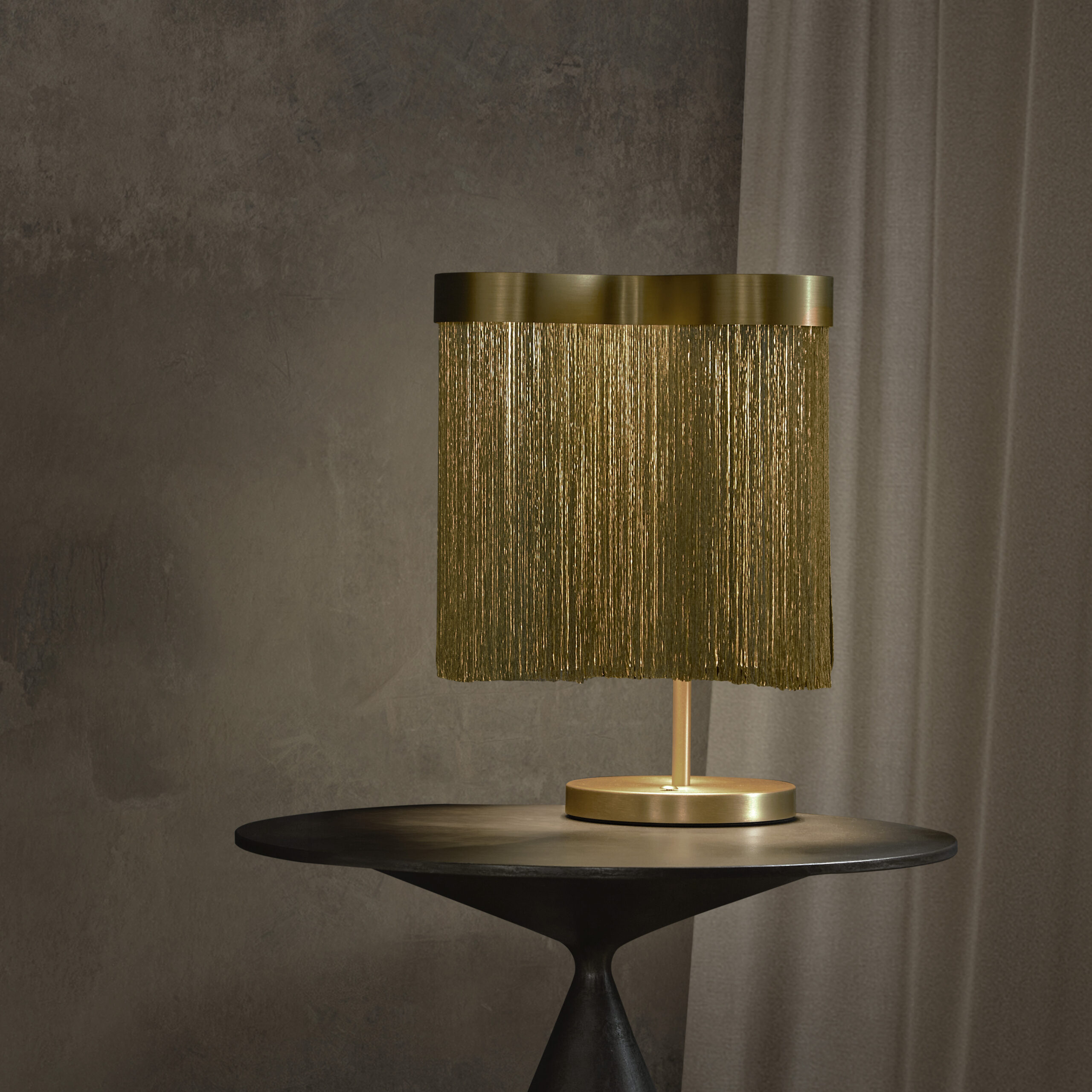 Arcipelago embodies the refined aesthetic of Servomuto, featuring a satin brass body and fire-resistant Trevira CS fringes.