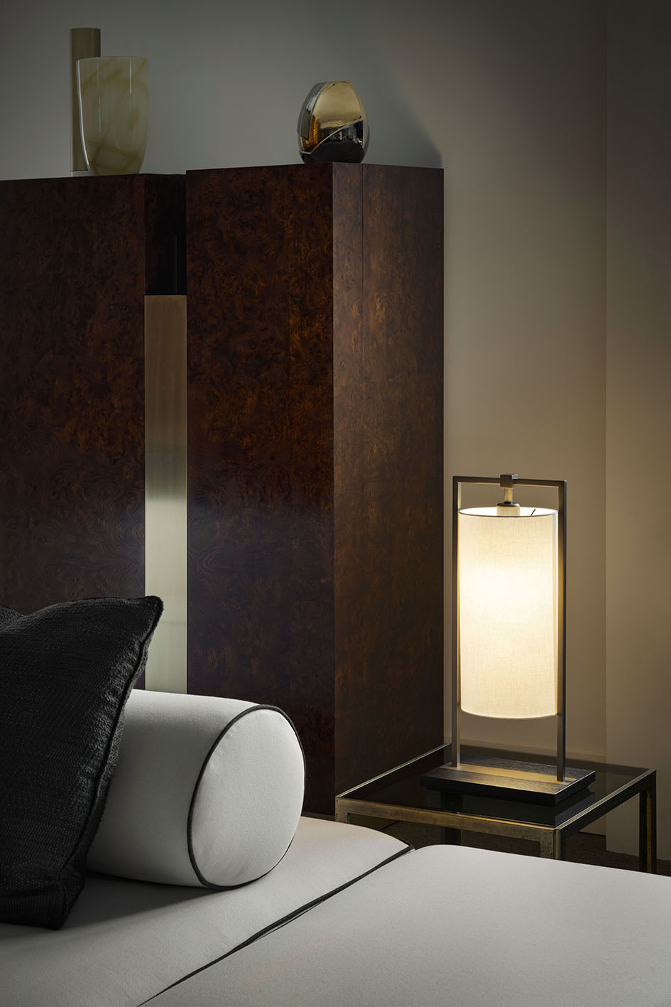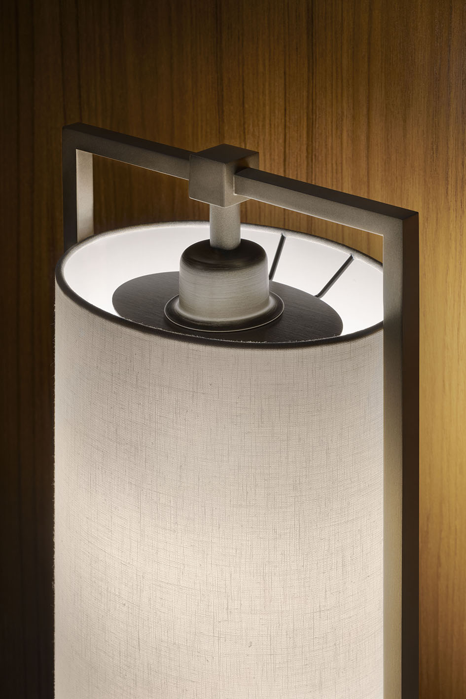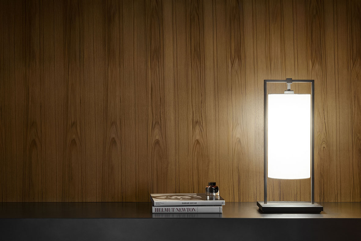 The shade is made with white linen, for a couture touch. The base is in dark-brown oak, with brushed bronze-nickel finish inserts to emphasise a sense of balance.