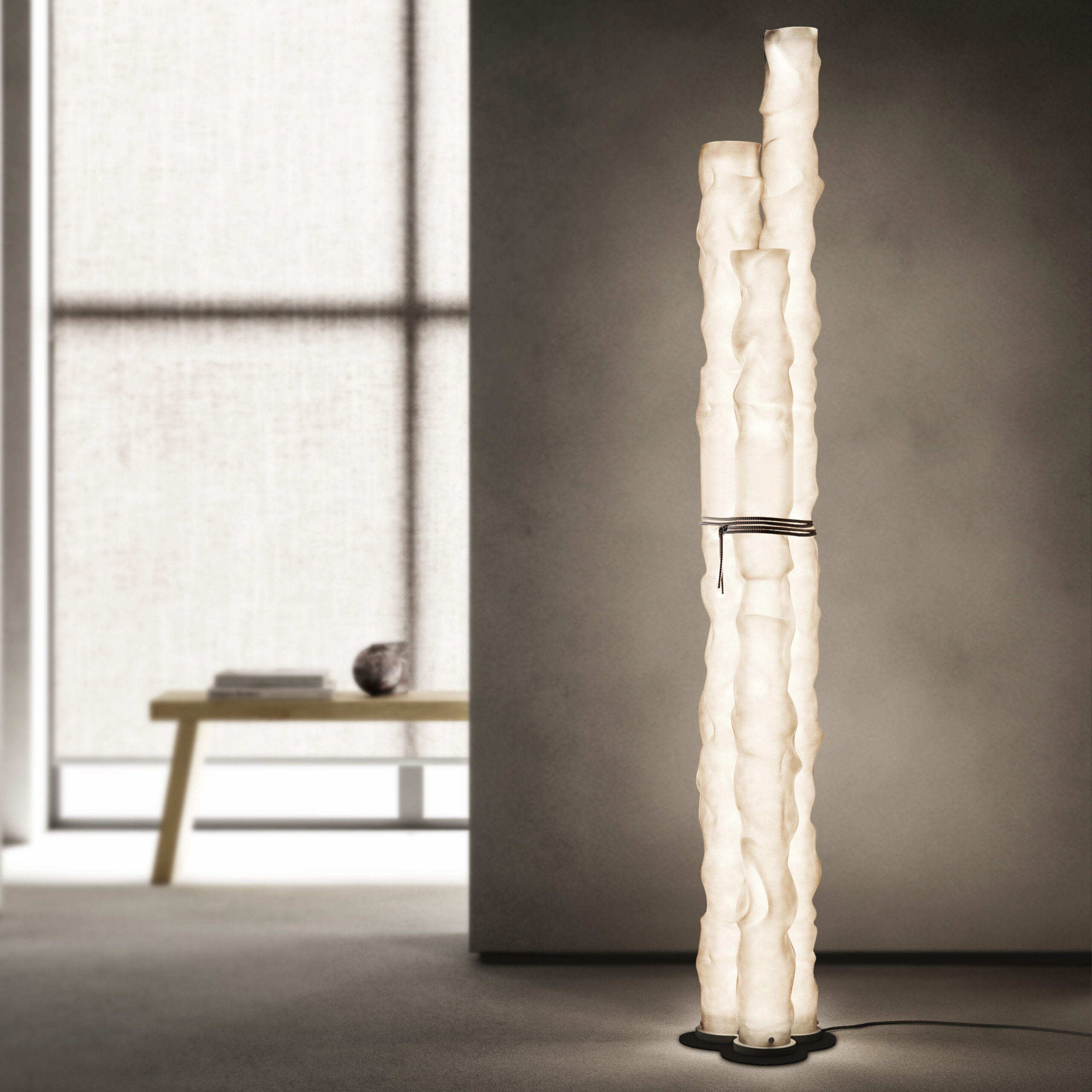 The Baggy Trio floor lamp is composed of three elements in double-satin polycarbonate diffusers of different heights – 150, 160 and 180 cm – with the irregular appearance of a crumpled paper tubes, while the base is in grey finish. The distinctive soft textile cord in white/grey – a detail that expresses the brand’s archi-decorative stylistic code – becomes a joining element for the table and floor variants adn supports the lamp in the suspended version.
