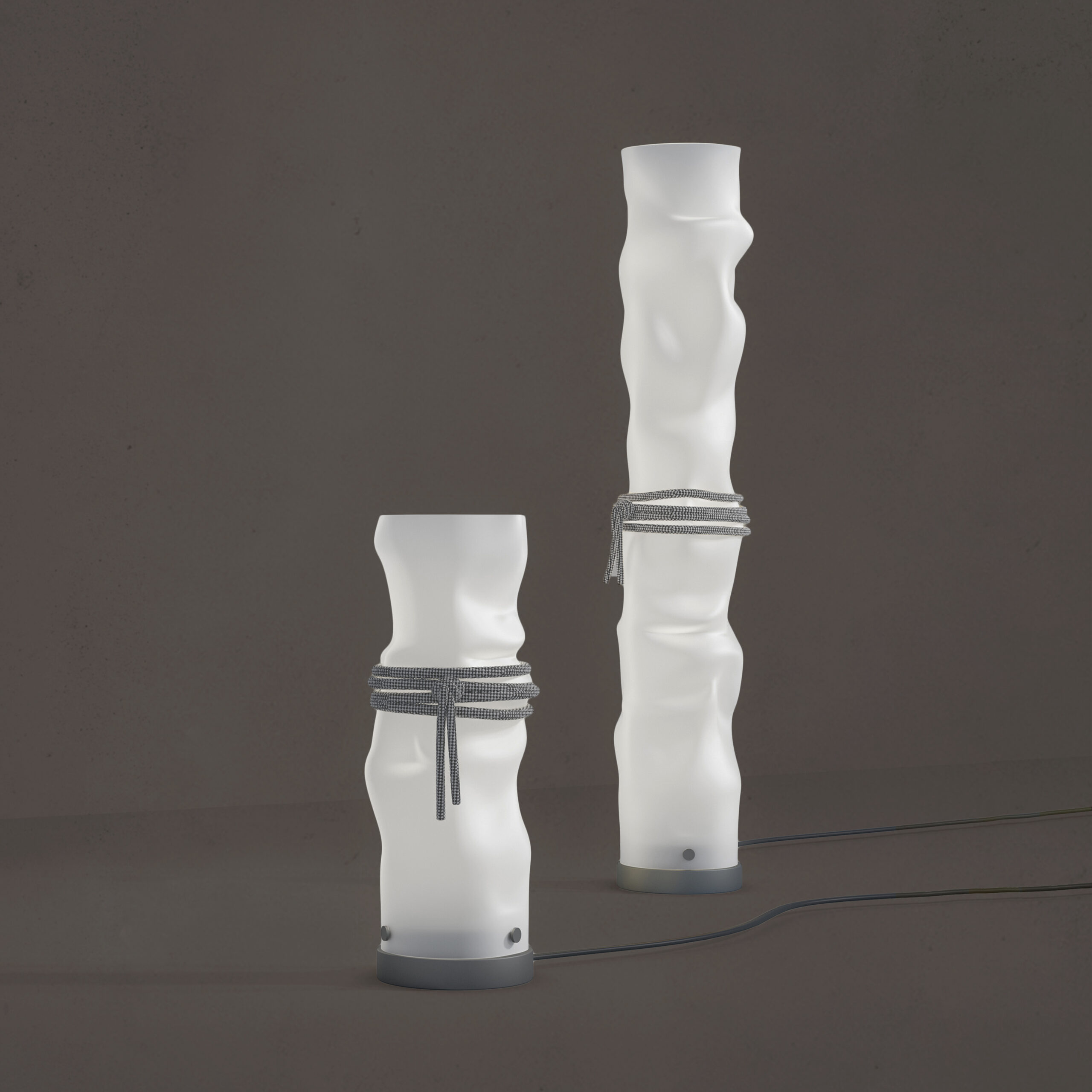 The Baggy table lamp (small and medium) has a double-satin polycarbonate diffuser with the irregular appearance of a crumpled paper tube, while the base is in grey finish. The distinctive soft textile cord in white/grey – a detail that expresses the brand’s archi-decorative stylistic code – becomes a joining element for the table and floor variants adn supports the lamp in the suspended version. The product is available in two heights: 30 and 60 cm.