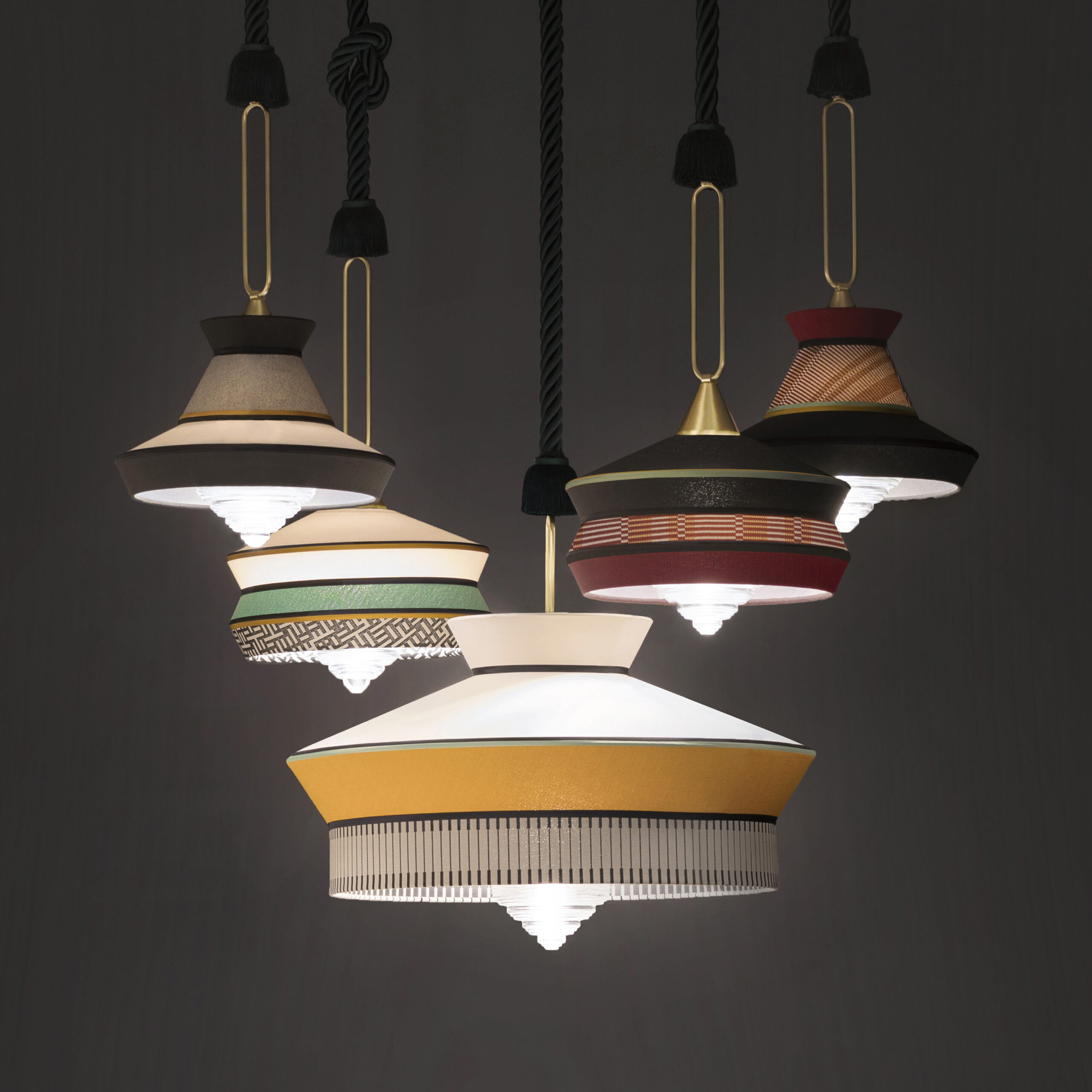 Calypso is a lamp collection inspired by the Art Deco period. Featuring fabrics with black-and-white geometric patterns blended with vibrant colors inspired by South American and tropical cultures, it achieves a highly original result.