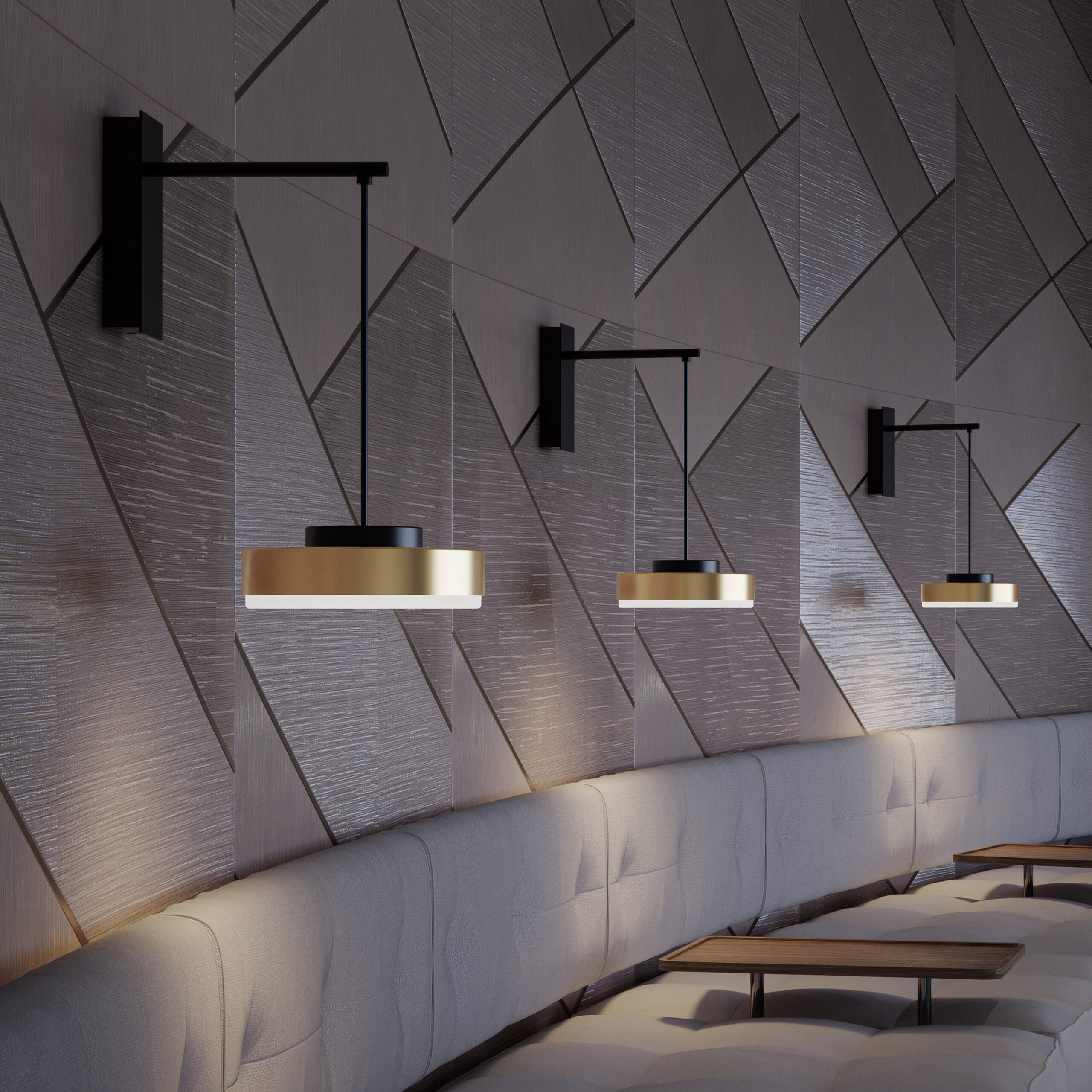 Born from the research conducted by MKV Design Studio, Discus is offered in three variants of different sizes: suspension, applique and ceiling. This product range boasts a minimalist look, with a decisive and dynamic graphic line where light, shape and decoration frame the space in an evocative and contemporary way. Two metal discs, which can be white or black, enclose the illuminating source in an interlocking game. The white opal diffuser in the middle is framed by a semi-polished brass band that gives a touch of luxury to the design. The particular shape of the structure, which in the wall version has a 120°rotating arm, allows the light to spread uniformly over the entire surface – this makes the product ideal for any location and use, in both residential and high-end hospitality contexts.