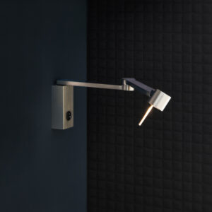 The model is highly customizable, allowing for choices in leather colors, arm length, and the shape and finish of the wall base.