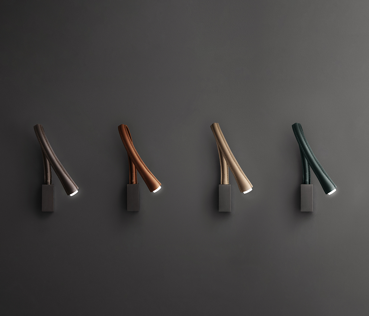 Flexiled, a historic and iconic product in Contardi's collection, is available in two variants: with a flexible arm covered in leather with double side stitching or encased in a steel mesh wrapped in a transparent sheath. It offers customization options in colors and sizes.
