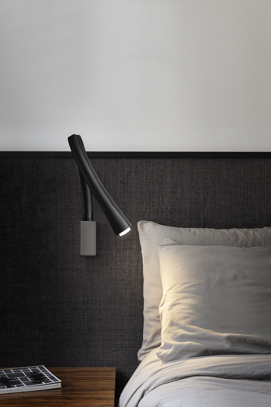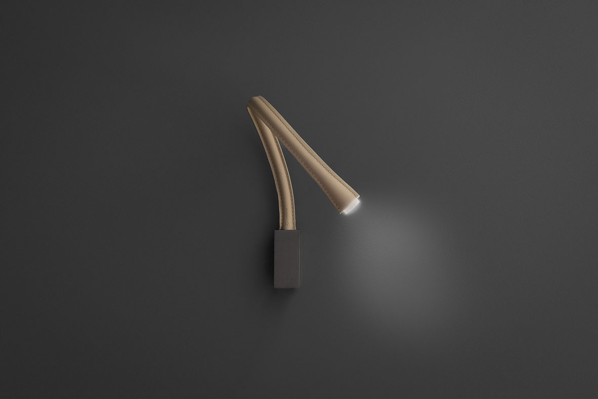 Flexiled, a historic and iconic product in Contardi's collection, is available in two variants: with a flexible arm covered in leather with double side stitching or encased in a steel mesh wrapped in a transparent sheath. It offers customization options in colors and sizes.