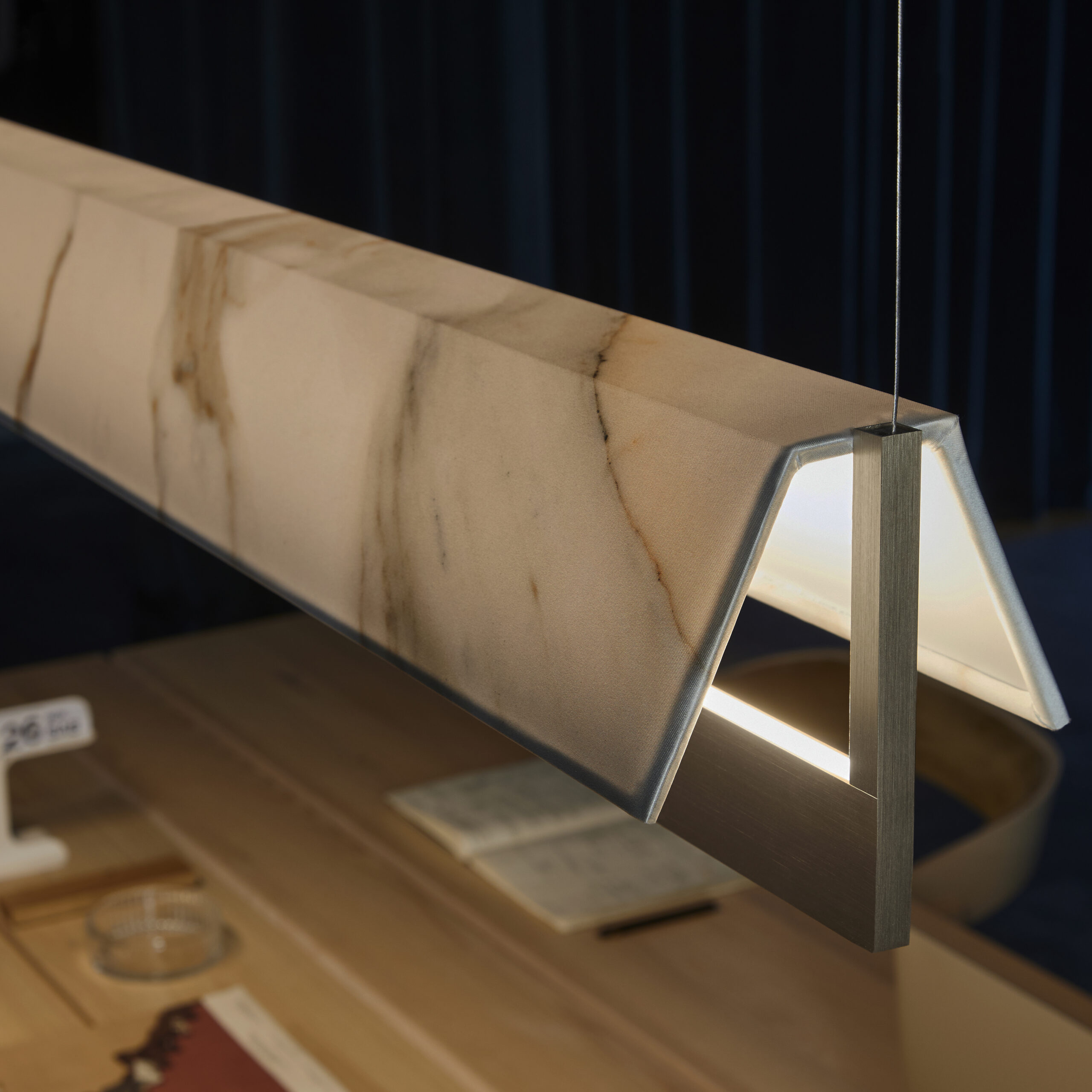 Fly’s light bar, available in satin golden nickel, brushed bronze-nickel and anthracite finishes, is delicately shaded by a textile diffuser in either white cotton or Calacatta marble-effect fabric.