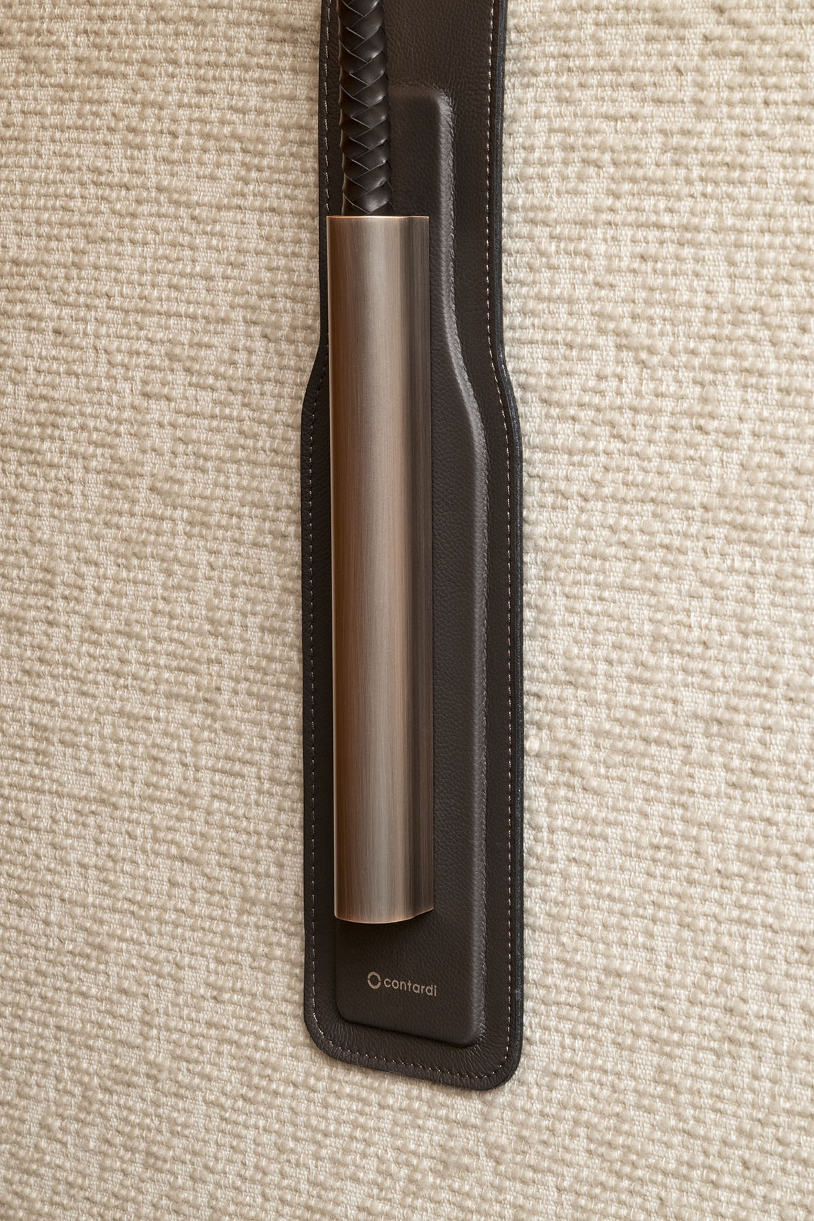 The head echoes the design of a cocktail jigger (G+T stands for Gin & Tonic), while the flexible arm is made of brass covered in woven leather.