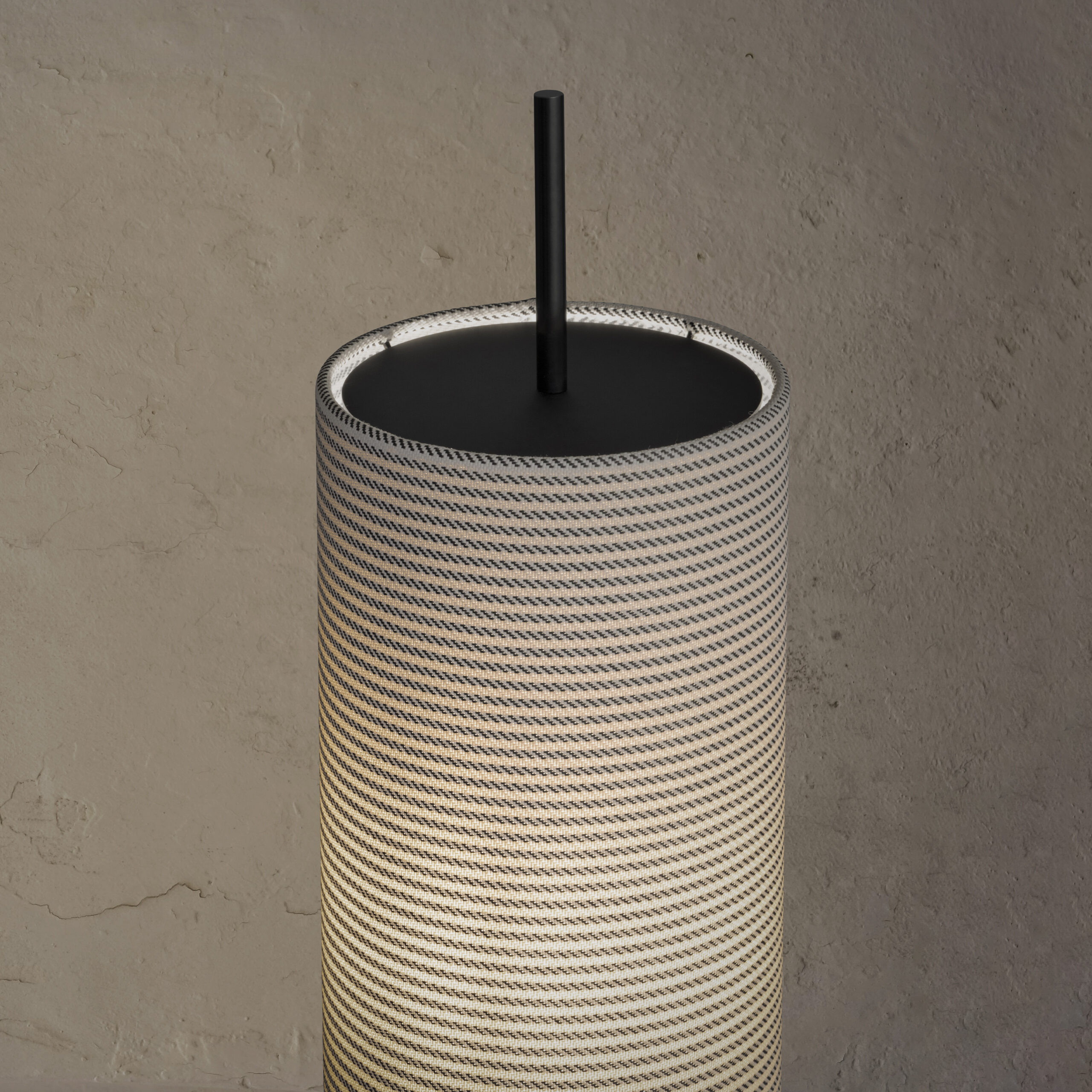 Characterized by a textured black metal structure with a round base, Lagoon features lampshades with a clean, essential shape, all covered in Dedar fabric. The shade colors, defined by neutral tones to suit any outdoor setting, vary according to size: black for the small version, beige for the medium, and white with horizontal black decorations for the large.