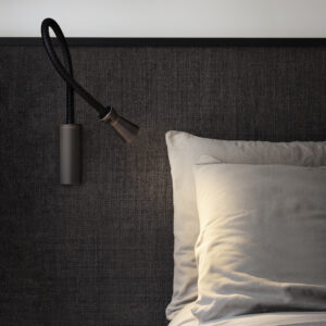 It can be used at the bedside or directly on the headboard, and is characterised by a double-jointed arm that moves both on the axis of the base and on the joint between the two arms. The head is also adjustable.