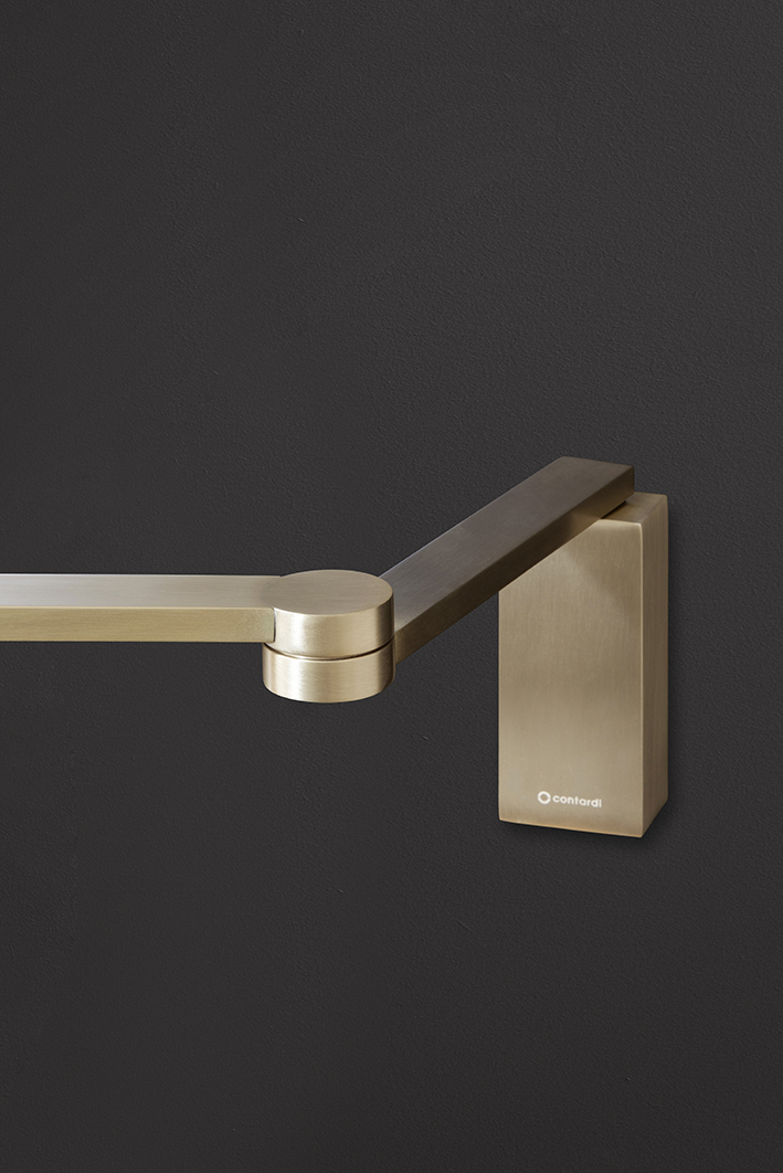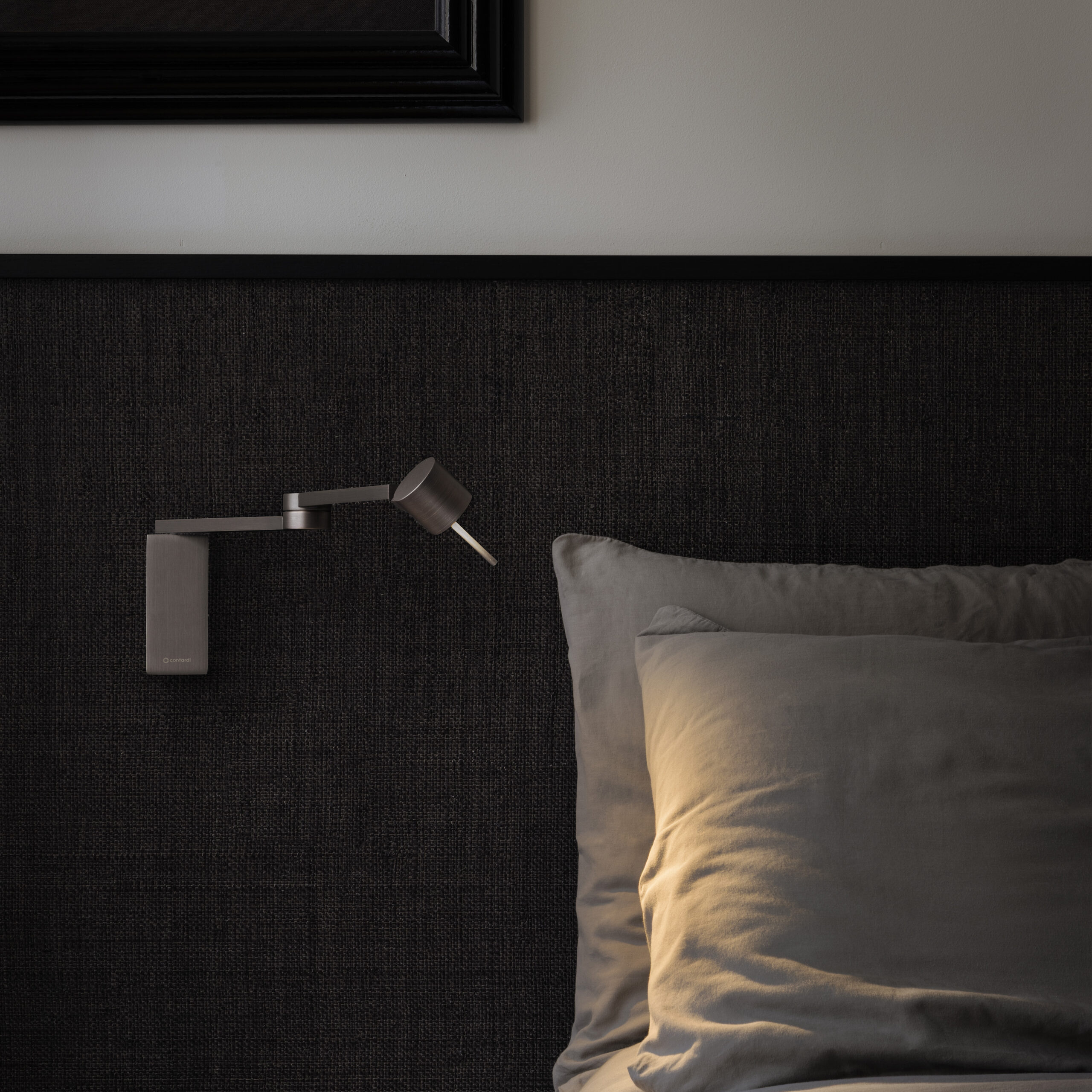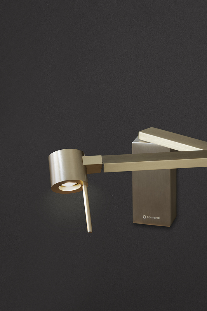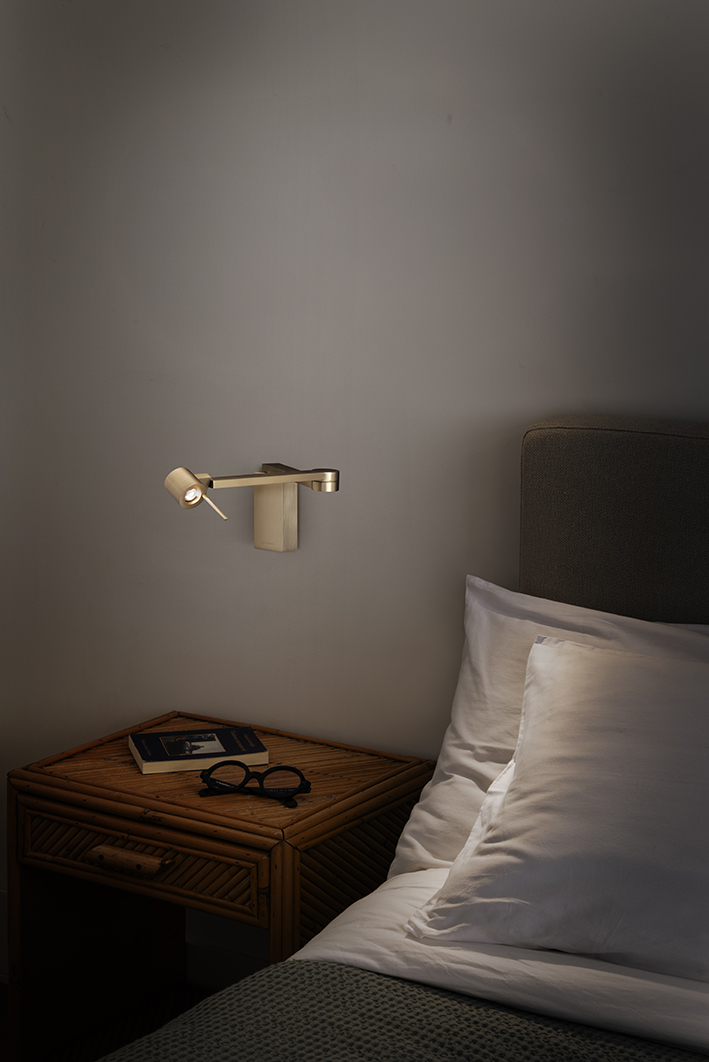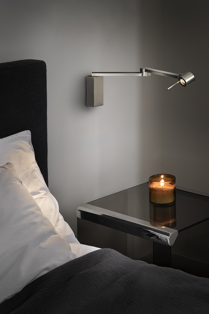 It can be used at the bedside or directly on the headboard, and is characterised by a double-jointed arm that moves both on the axis of the base and on the joint between the two arms. The head is also adjustable.