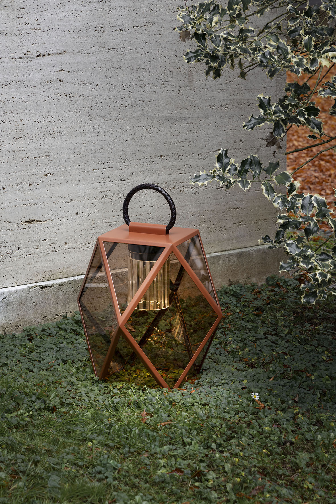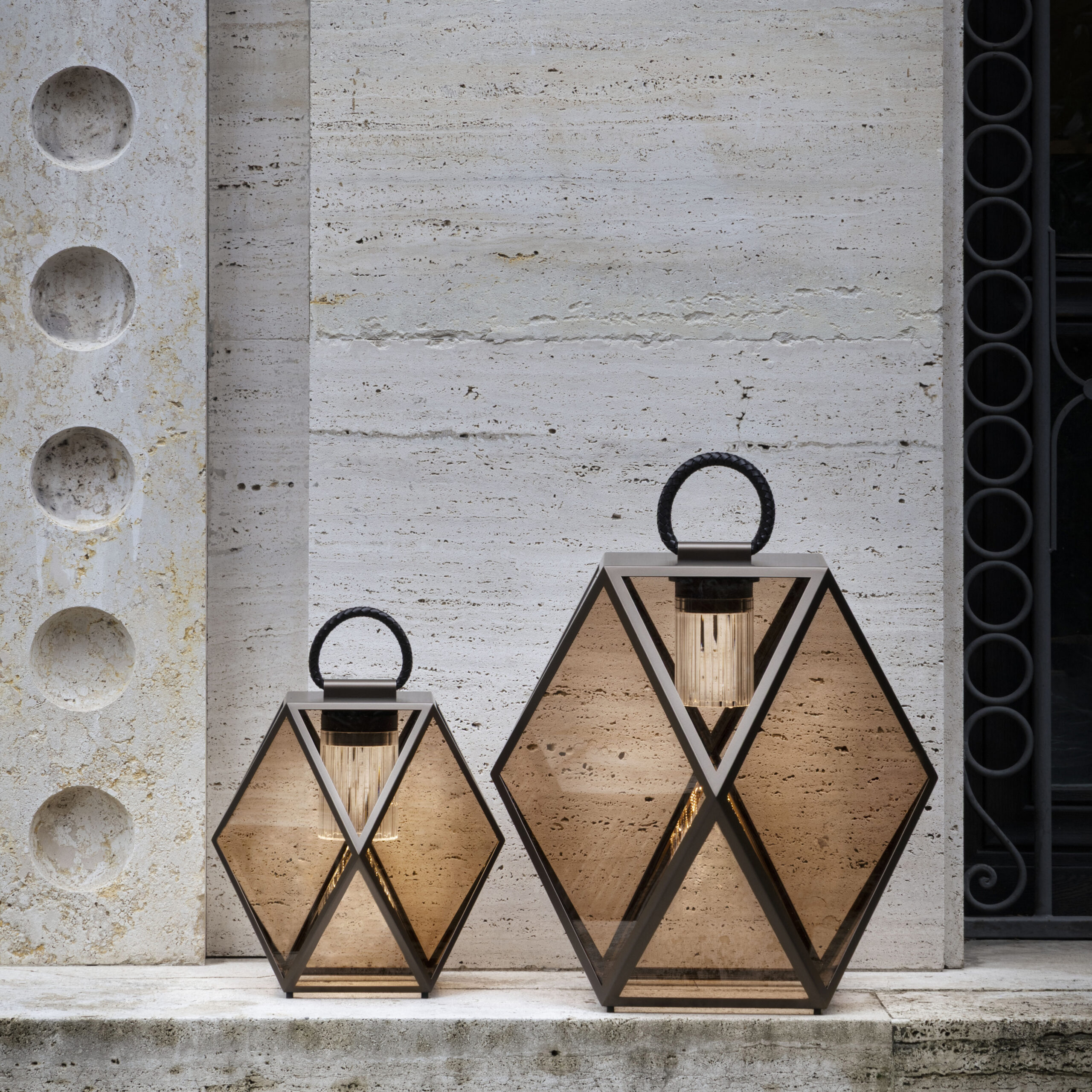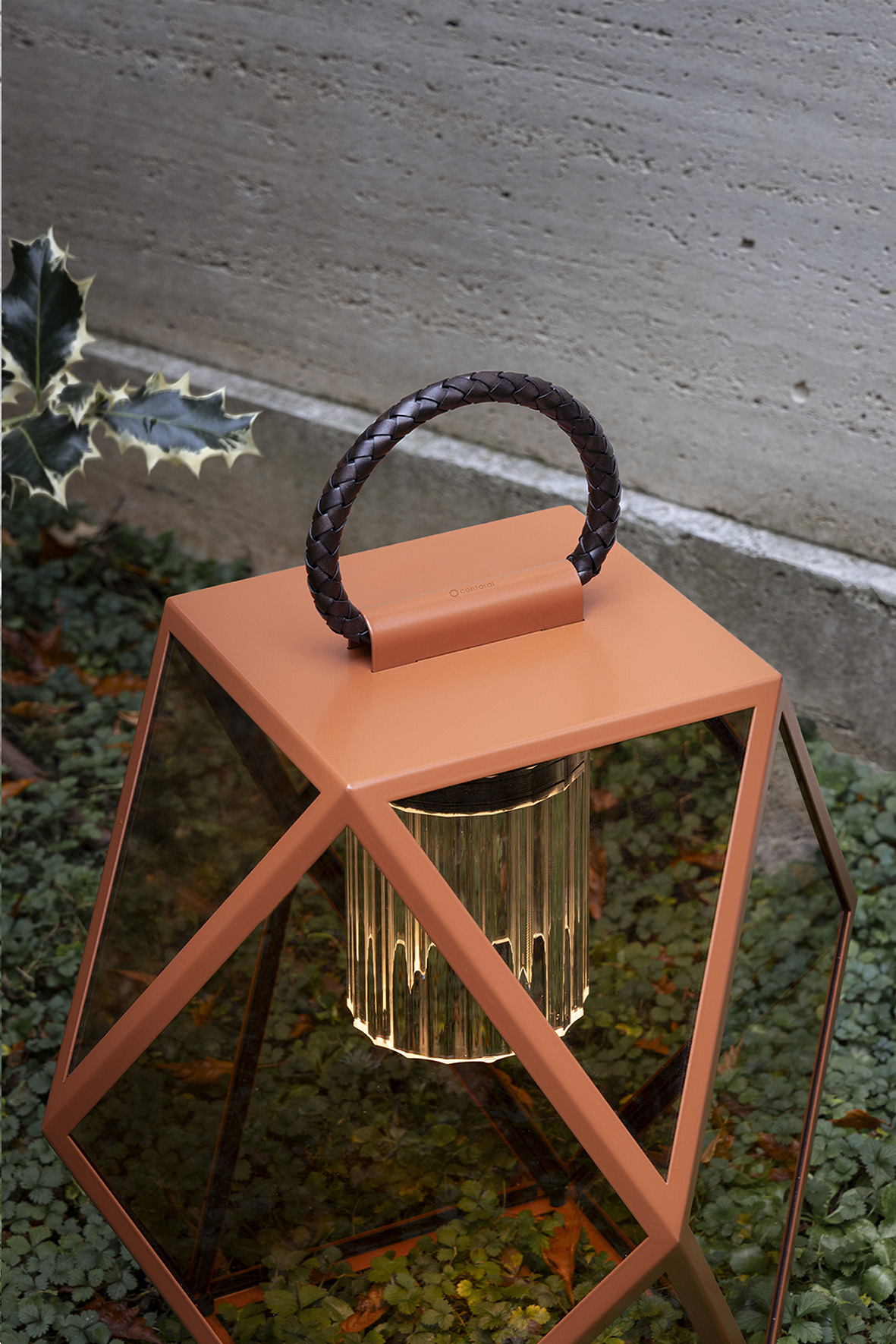 The metal structure of Muse—now available in four new finishes: black, bronze, terracotta, and a refined cream color—is enhanced by a leather handle that allows the lamp to be moved with ease, both outdoors and indoors: on the floor, on a table, by a pool, or to illuminate the deck of a boat.